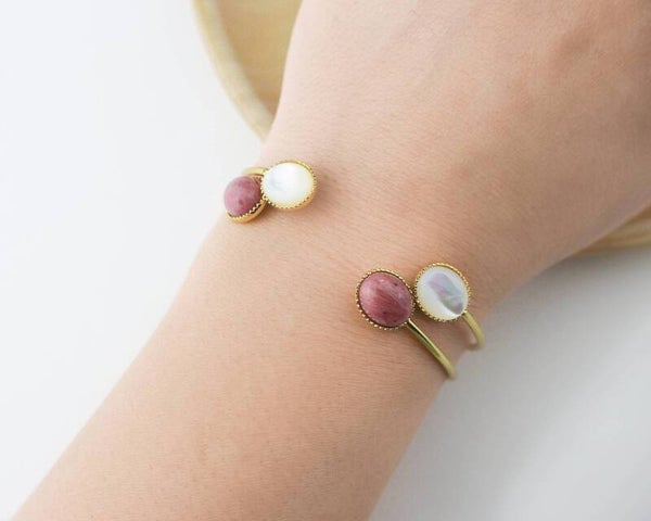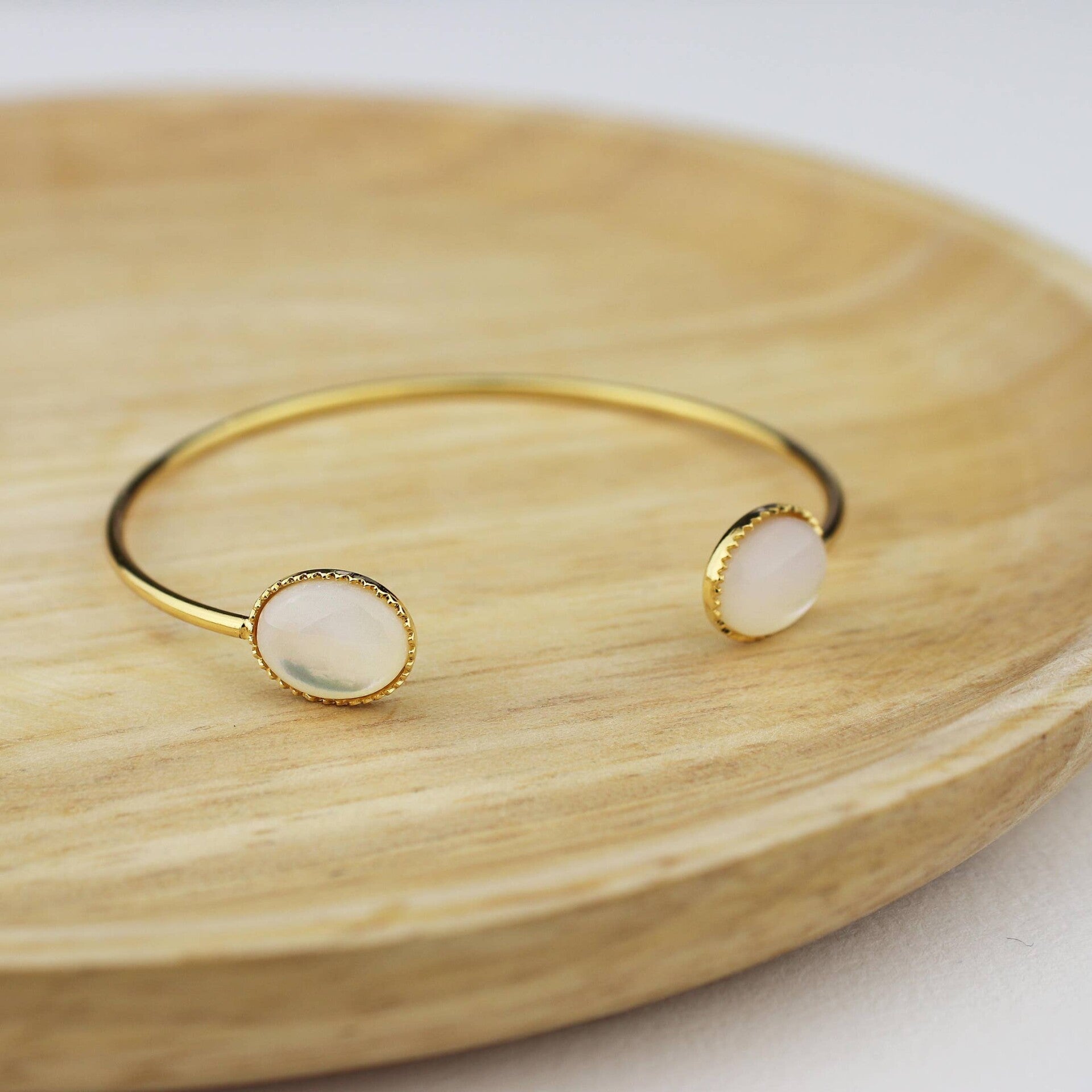 Jonc en laiton doré à l'or fin et deux pierres ovales de Nacre de 10x8mm chacune.
