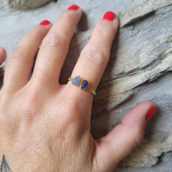 Bague fine en acier inoxydable composée de deux pierres naturelles en forme de goutte.